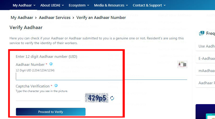 4 – उसके बाद आपको अपना आधार न लिखना है और केप्चा लिखना है और प्रोसीड तो वेरीफाई पर क्लिक करना है जब आप वेरीफाई पर क्लिक करेंगे तो आपके सामने नया पेज खुल जायेगा जिसमे आपके मोबाइल न के लास्ट के 3 डिजिट लिखे होने वही आपका न आपके आधार में लगा है