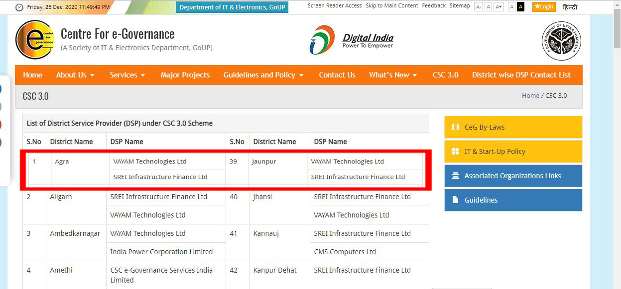 2 – इस फोटो में लाल बॉक्स के अन्दर जो CSC 3.0 लिखा है उसपर आपको क्लिक करना है और एक नया पेज खुल जायेगा जिसमे आपके राज्य के सभी शहर के नाम दिए होंगे और साथ ही सामने उनकी कम्पनी के नाम भी लिखे होंगे